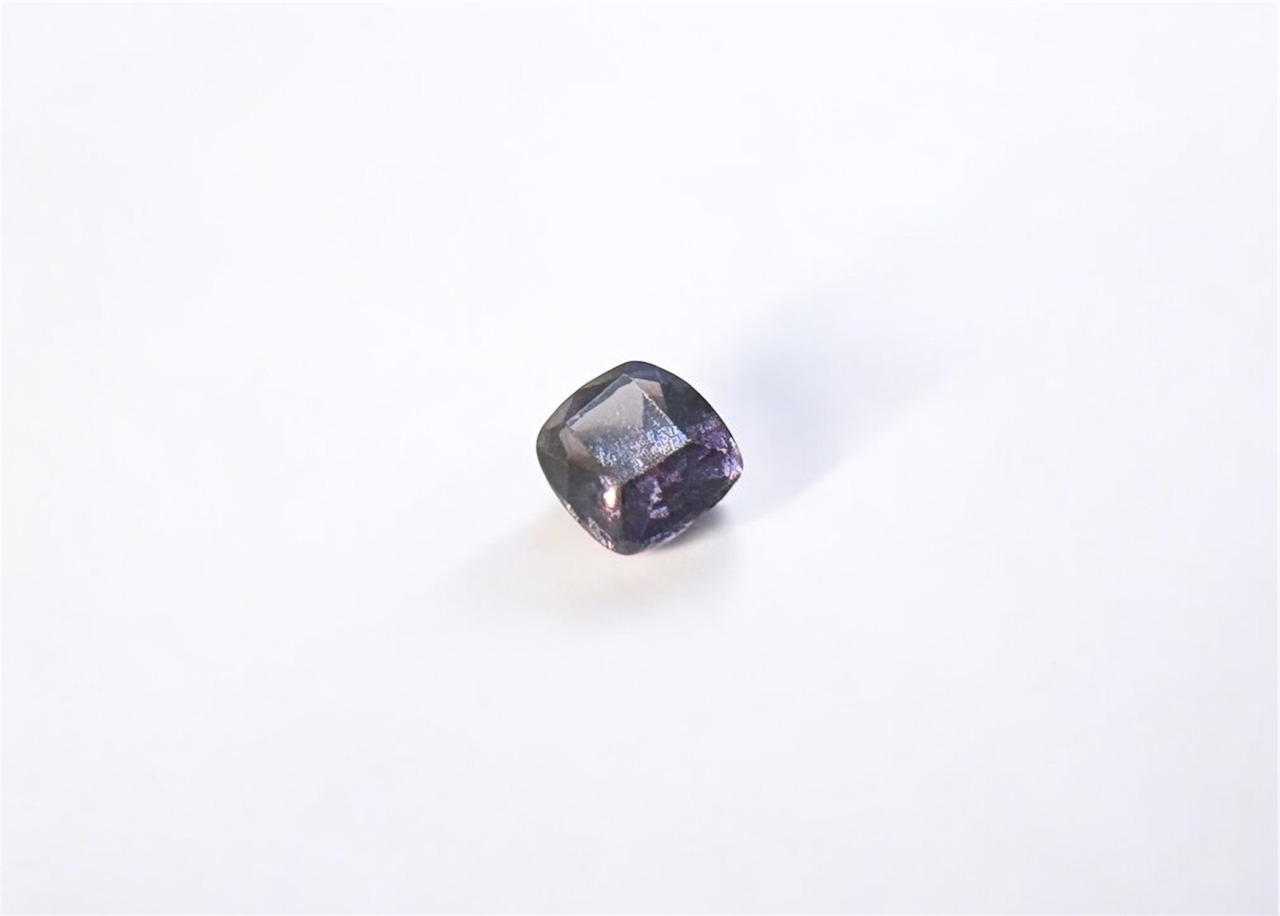 クッションカットの端正なフォルムは、紫の輝きと青の陰影を交互に映し出し、